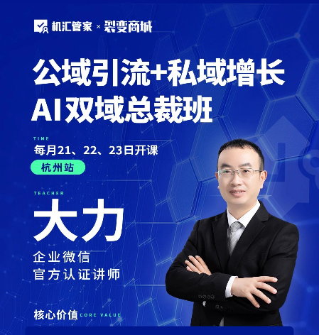 ✨公域引流+私域增长【AI双域总裁班】 ✨ 机汇、5G数研院、企微服务联合举办 ✨ 三天两夜,2人参课,1年免费复训 ✨ 带电脑、无线上网、手机装企业微信 ✨ 价格:4980元/家(原价9980) ●学完带回家的21个执行工具● ● 1、落地测评企业数字化能力 ● 2、各类场景SOP执行 ● 3、业务模型及标签库 ● 4、8大部门文档知识库索引 ● 5、私域阶段性目标设定 ● 6、IP流量人设打造方法 ● 7、引流品爆品的策划 ● 8、场景化的办公协同文档模板 ● 9、精准营销流程 ● 10、引流矩阵打造 ● 11、视频号引流方案 ● 12、视频号前500带货达人对接 ● 13、抖音引流方案 ● 14、百度精准引流方案 ● 15、展会引流方案 ● 16、门店引流方案 ● 17、用户裂变方案 ● 18、半自动社群运营策略 ● 19、私域岗位职责操作手册 ● 20、活动策划流程与营销日历 ● 21、百日业绩冲刺策划与执行 4980元学会一样就值了! ●讲师团队● ● 企业微信官方认证高级讲师 ● 机汇成功运营团队 ● 公域AI引流实战操盘手(外聘) ● 私域增长实战操盘手 ● 服务过上万家企业,精通多个行业私域打法! 报名:请联系邀请你的人 欢迎走进【AI双域总裁班】! ●客户反馈● 内容评分 讲师评分 印象深刻的是哪个板块? ●往期课程学员收获● •用企业微信可以轻松地留存、分类、管理客户,打通CRM,价值很高,对内提高效率降本,对外业绩增长增效 • 数据的威力或者说软件的部分功能超出我的认知,比如可以查看文件阅读时间,是否有进行转发,跟客户聊了几分钟等 • 精准营销是在对的时间,给对的客户,提供对的产品,无数据,不决策 • 企业要从经营位置到经营人、流量思维转变成留量思维 • 做好公司方向定位,确认好你的产品所服务的客群,你能为你的这部分客群创造的价值,就是你的竞争优势 • 企业微信协同功能强大,管理业务智能化,对企业微信和私域营销有了更深度的认知 • 私域增长要做好,企业微信工具用起来,公域私域联动 AI赋能企业业绩增长 数据驱动,让营销更轻松! ●往期照片合影● 报名:请联系邀请你的人 费用:4980元/家/2人 地址:杭州滨江智慧之门A塔 私域运营没有经过专业辅导的五大“死法” 1、顶层定位不对——找死! 2、软件功能不全——累死! 3、数据没有打通——冤死! 4、运营管理缺失——气死! 5、缺乏系统思维——悔死! 减少摸索时间 提升引流效果 避免不必要的推广损失 用好软件提升效率 欢迎走进 AI公域引流+AI私域增长 【AI双域总裁班】! 课程面向全国招商! AI培训、智能化发展是 2025年最火爆、增长最快的行业! 低成本启动,资金周转迅速, 盈利潜力大,长期发展前景广阔。 现在加盟我们,我们将全力支持, 我们拥有20多年的 信息化、数字化、智能化软件系统 与运营经验。 提供全套营销素材! 共同迈向成功之路! 如果你是:培训公司、软件销售公司、 互联网服务、新媒体服务企业、 网络推广服务、商协会组织 等企业服务机构, 欢迎来合作!